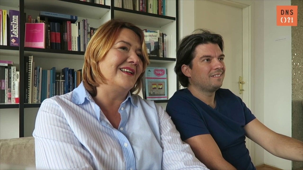 Posnetek traja 1 minuto in 39 sekund. Vizualni okvir: kolaž dveh fotografij z napisom “Pogovor Vesne Vukovič in Barbare Helbl”.