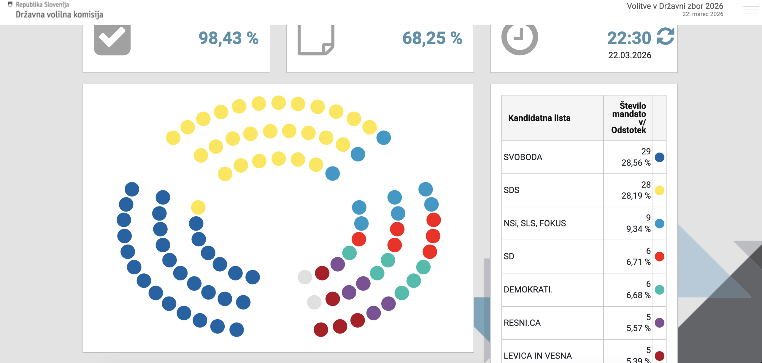 Ob 98,43 odstotka preštetih glasovnic se kaže izjemno tesen razplet parlamentarnih volitev. Gibanje Svoboda je prejelo 29 mandatov (28,56 odstotka), Slovenska demokratska stranka (SDS) pa 28 mandatov (28,19 odstotka).